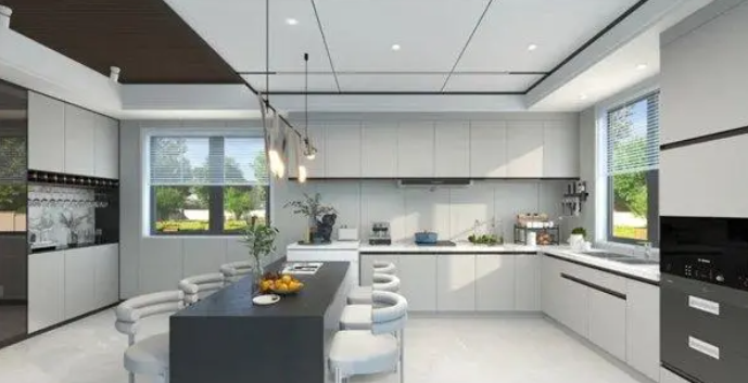 頂部以白色蜂窩大板吊頂,線型燈帶和筒燈相結(jié)合,打造簡約時(shí)尚現(xiàn)代廚房。